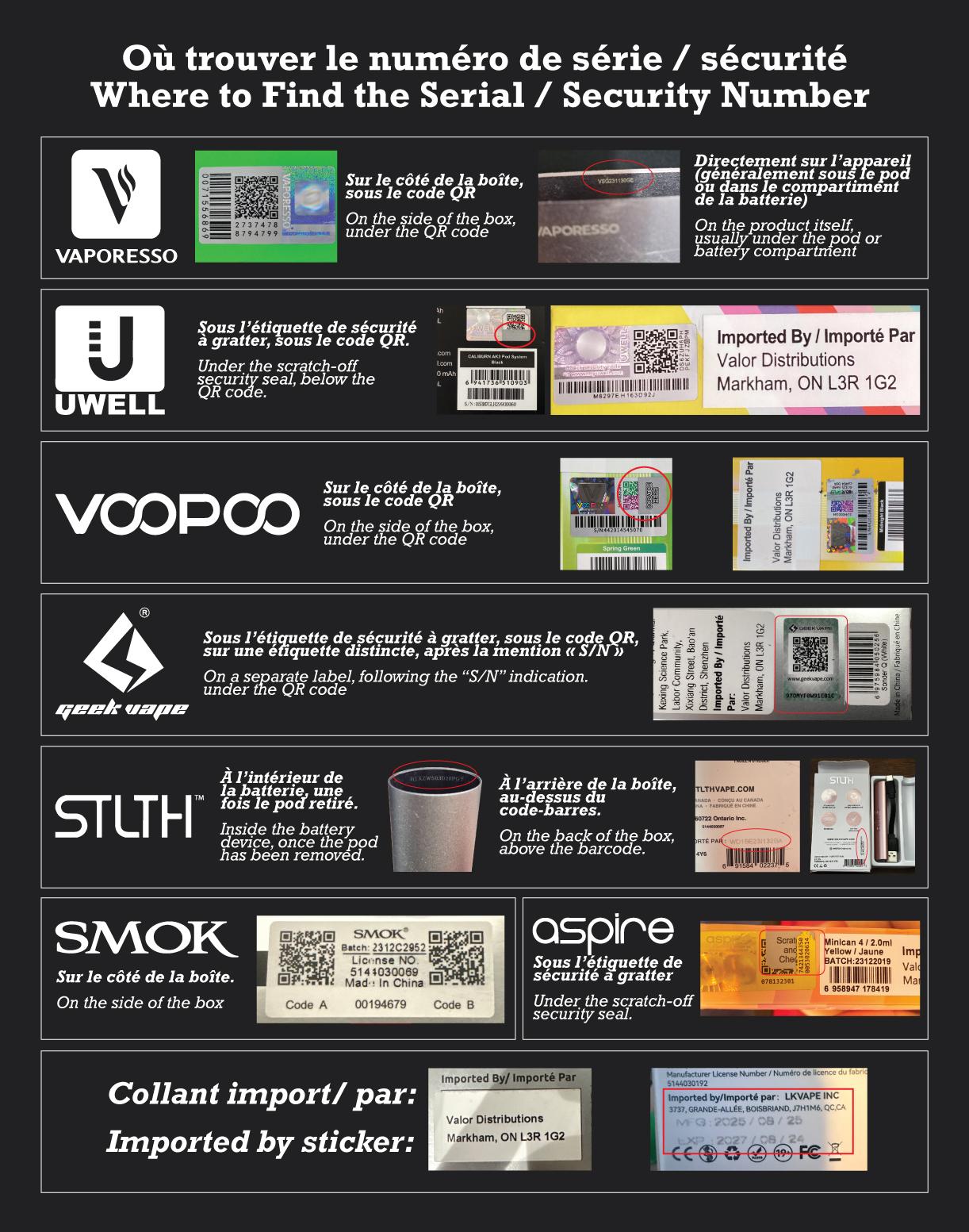 Nous avons besoin de deux photos pour chaque produit à ajouter dans le formulaire : Une du numéro de série, et une de l'information 'Importé par'.
