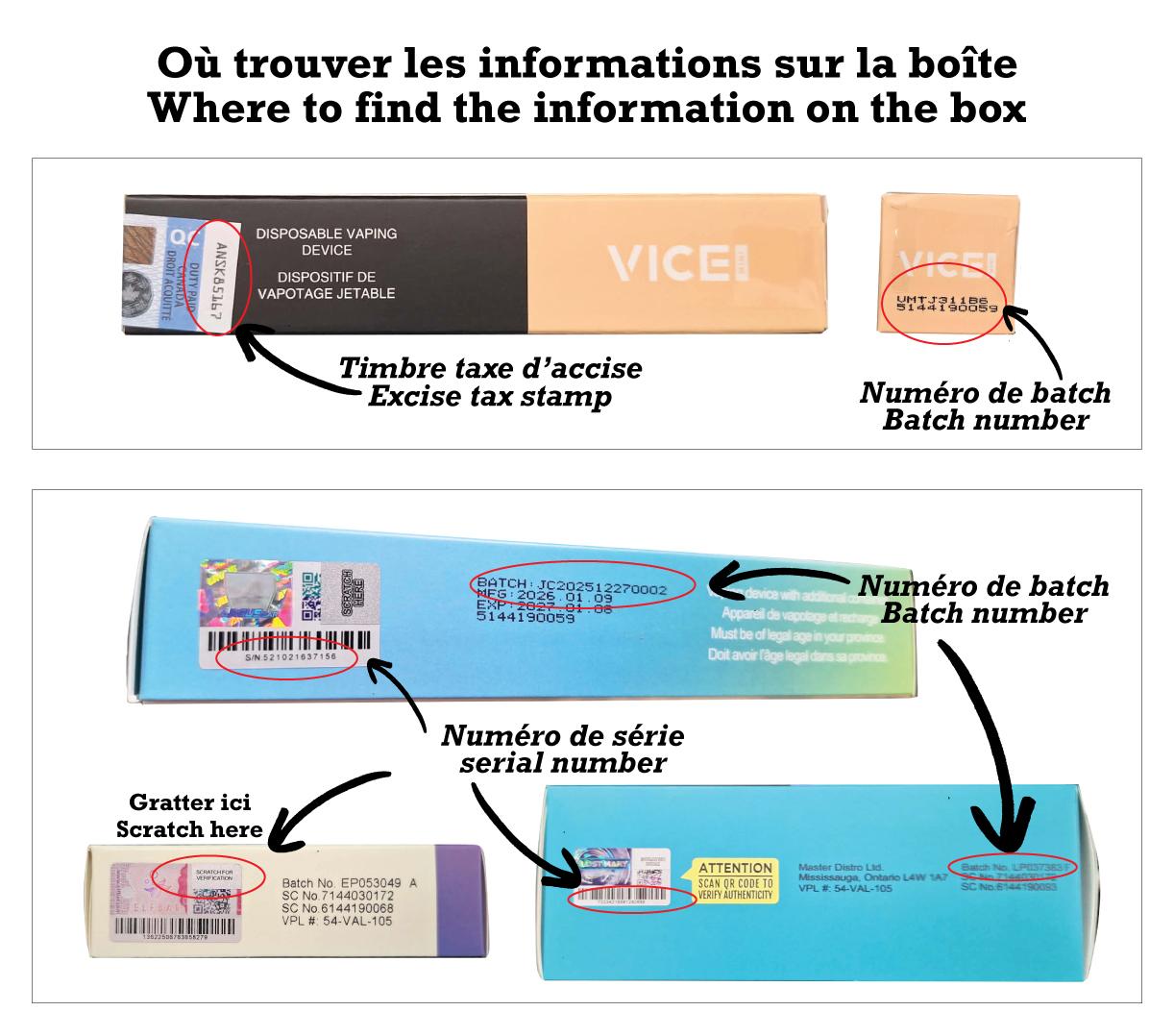 Photo du timbre de taxe d’accise ainsi que le numéro de lot obligatoire pour les disposables.